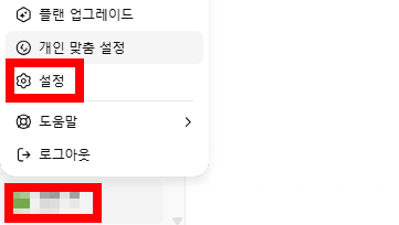 계정 메뉴를 클릭한 뒤, 팝업 창에서 **‘Settings(설정)’**을 선택합니다.
